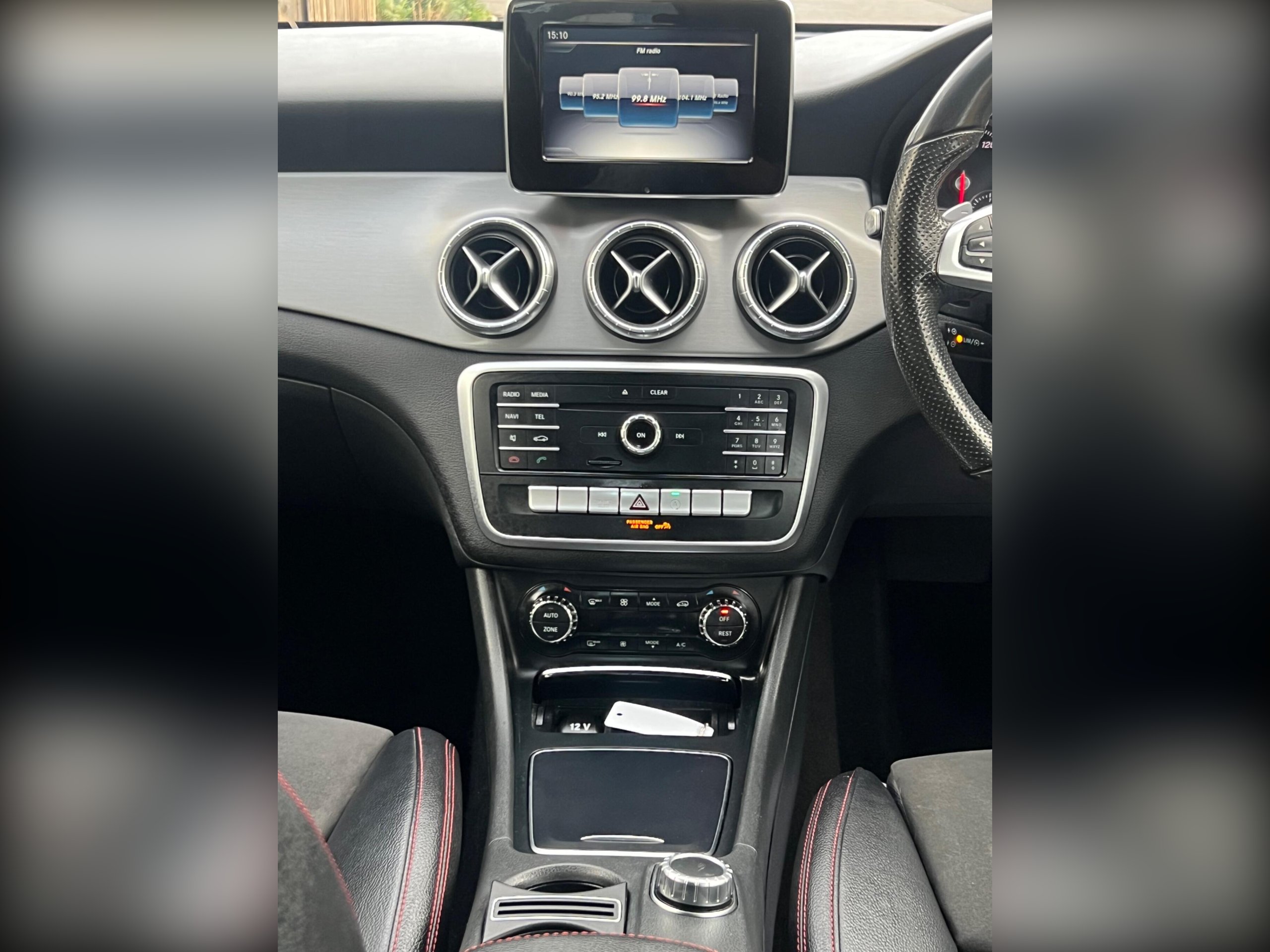 - Steering Wheel - 3-Spoke - 12 Button Multifunction Sports Steering Wheel Trimmed in Leather with Perforated Grip Area - Flattened Bottom Section and Red Contrast Stitching
